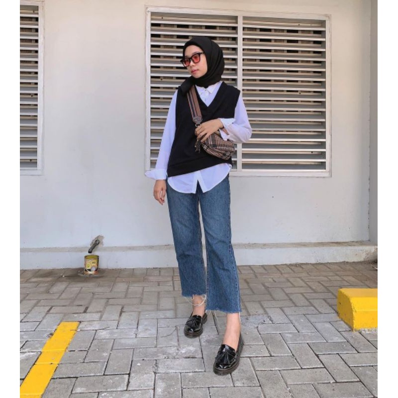 kamu bisa menggunakan atasan kemeja lengan panjang yang dilapis vest gelap di luar. Untuk bawahan jeans bisa kamu jadikan pilihan untuk